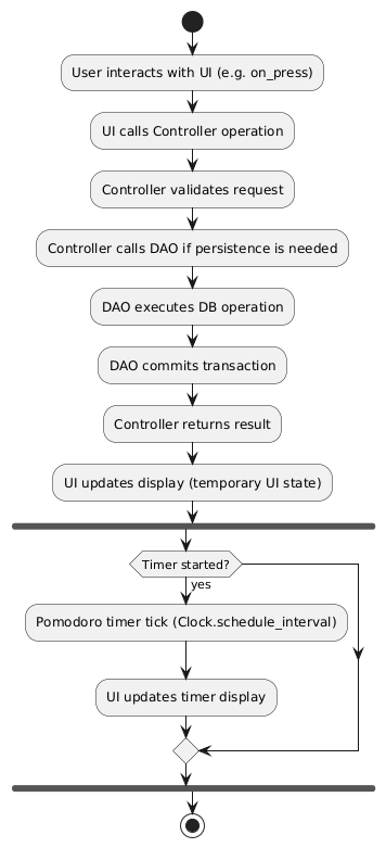 Pomodoro timer uses Clock.schedule_interval for ticking; it is UI-bound and purely local. Kivy manages these scheduled calls through its main event loop, which is the core mechanism that keeps the application running and responsive. In unit tests, real time is not allowed to elapse; instead, clock ticks are simulated by manually advancing Kivy’s clock, which makes it possible to verify the timer’s behavior quickly and without delays.