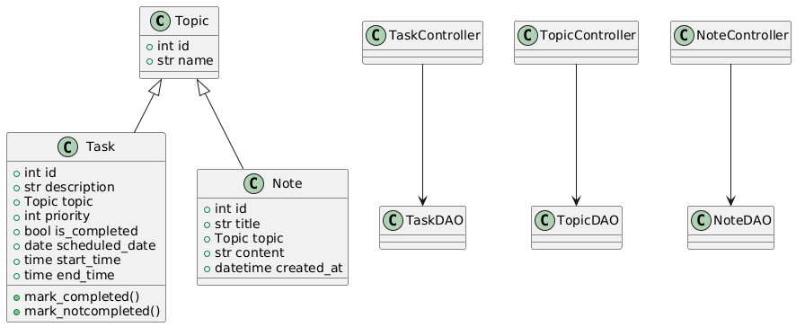- TopicDAO, TaskDAO, NoteDAO encapsulate SQL for CRUD operations