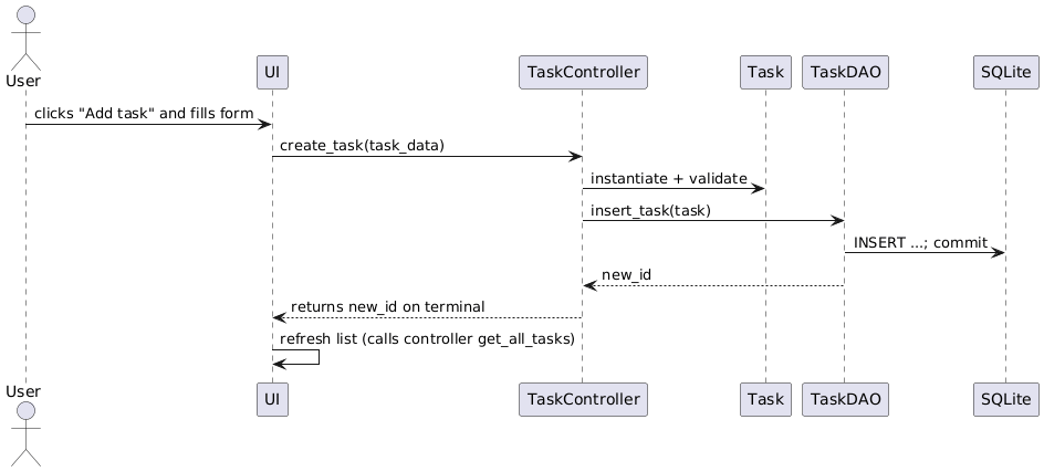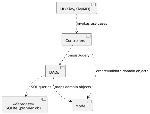 - Controllers: implement application use cases (create task, schedule task, mark complete, etc.). They convert user input into domain objects and call DAOs. They return domain objects to the UI.